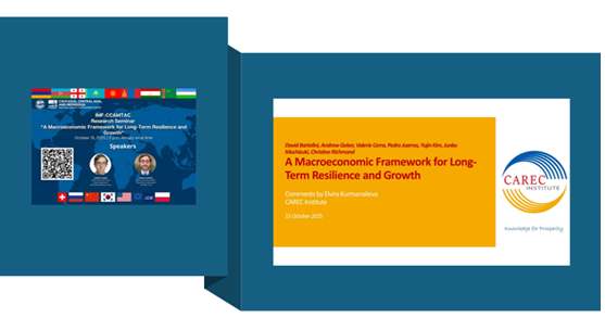 On 15 October, Dr. Elvira Kurmanalieva, Senior Economist at the CAREC Institute, participated as a discussant in the Research Seminar on “A Macroeconomic Framework for Long-Term Resilience and Growth,” organized by the IMF Caucasus, Central Asia, and Mongolia Regional Capacity Development Center (CCAMTAC).