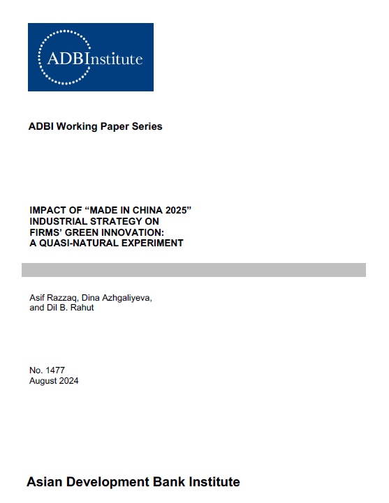 The Asian Development Bank Institute (ADBI) has published a compelling working paper titled “Impact of ‘Made in China 2025’ Industrial Strategy on Firms’ Green Innovation: A Quasi-Natural Experiment”, authored by Dr. Asif Razzaq. The paper examines how China’s industrial policy has significantly driven green innovation among enterprises, particularly in response to growing environmental challenges.